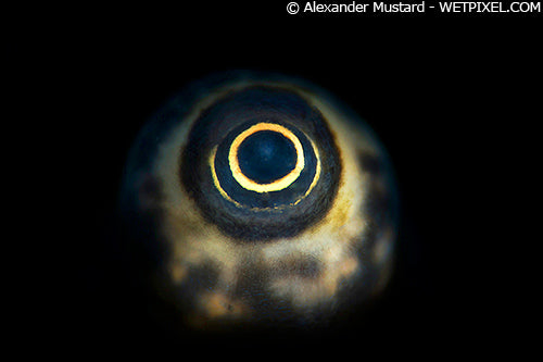 The eye of young woebegone shark in Batanta, Raja Ampat, photographed with the largest circular shaped aperture inserted in the LSD Prime. Nikon D4, Nikon 105mm VR. Subal housing. Single INON Z240, Retra LSD Prime. 1/320th @ f/13. ISO 125.