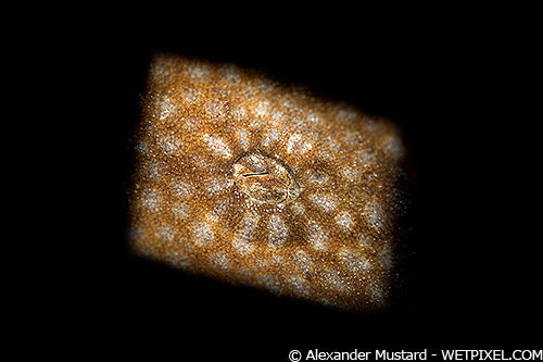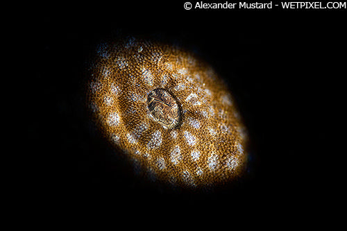 A rim-lit fire coral in Grand Cayman, shot with the LSD mounted on an on camera strobe, although with strobe arms long enough to reach around behind the subject. Nikon D4, Nikon 105mm VR and FIT prototype dioptre. Subal housing. Single INON Z240, Retra LSD Pro with circular insert with PLE. 1/320th @ f/22. ISO 200.