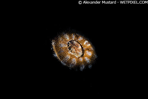 Close to the cowrie, above, I found this nudibranch on the seabed. I used the same setup, with just a minor tweak to strobe positioning, AF and ISO to quickly light the slug and not the surrounding seabed. Nikon D4, Nikon 105mm VR. Subal housing. Single Seacam 150, Retra LSD Pro. 1/250th @ f/32. ISO 100.