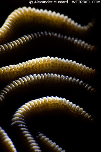 The ridges of a brain coral in the Cayman Islands picked out with narrow and strongly directional beam of the LSD. Nikon D4, Nikon 105mm VR and FIT prototype dioptre. Subal housing. Single INON Z240, Retra LSD Pro with PLE. 1/320th @ f/22. ISO 200.