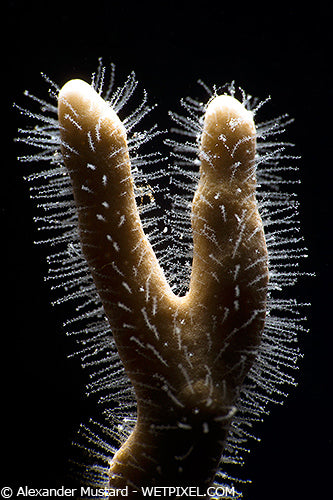 Backlighting has always been an excellent way to create very different types of images of familiar subjects. This effect can be easily achieved with on-camera strobes, providing your strobe arms are long enough to reach round behind the subject. But it is often easier to set up with off-camera strobes. Of the two examples below, the rim-lighting on the fire coral was with an on camera strobe and the x-ray lighting on the waspish was with an off camera strobe.