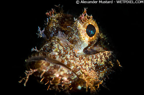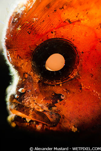 Face of a small scorpionfish on the reef, but photographed here with a back background by the careful aiming of the LSD. Nikon D4, Nikon 105mm VR, Subsee +5. Subal housing. Single INON Z240, Retra LSD Prime. 1/320th @ f/18. ISO 125.