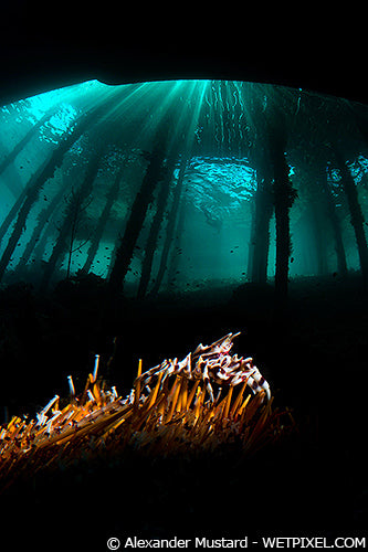 Many photographers struggle with backlighting because they are fooled by the name, thinking “to back light a subject, the strobe must be completely behind it”. This is incorrect. To achieve backlighting the back of the subject must be lit, but the source of the light should be outside the frame (in other words, off to one side, not directly behind it). The LSD is highly suited to this as it creates a narrow beam of light, which can be precisely aimed at the subject, to create the backlighting effect, while minimizing backscatter and keeping the source of the light hidden. If the subject is large enough to completely hide the light source, we can place the strobe directly behind it.