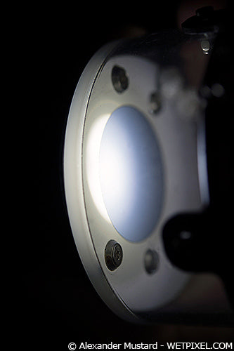 This photo shows the inside of the LSD Prime, when attached to an INON Z240. Note how the light from the strobe aiming light is not completely aligned with the intake for the LSD. This position of the LSD intake allows it to collect much more of the strobes flash power, but with the consequence that the aiming light coming through the LSD does not show the full area that will be illuminated. This issue only affects the use of the snoot with INON strobes.
