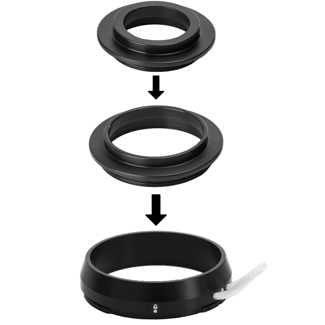 The larger diameter Macro ring is mounted onto the Reduction ring and locks via O-ring friction.